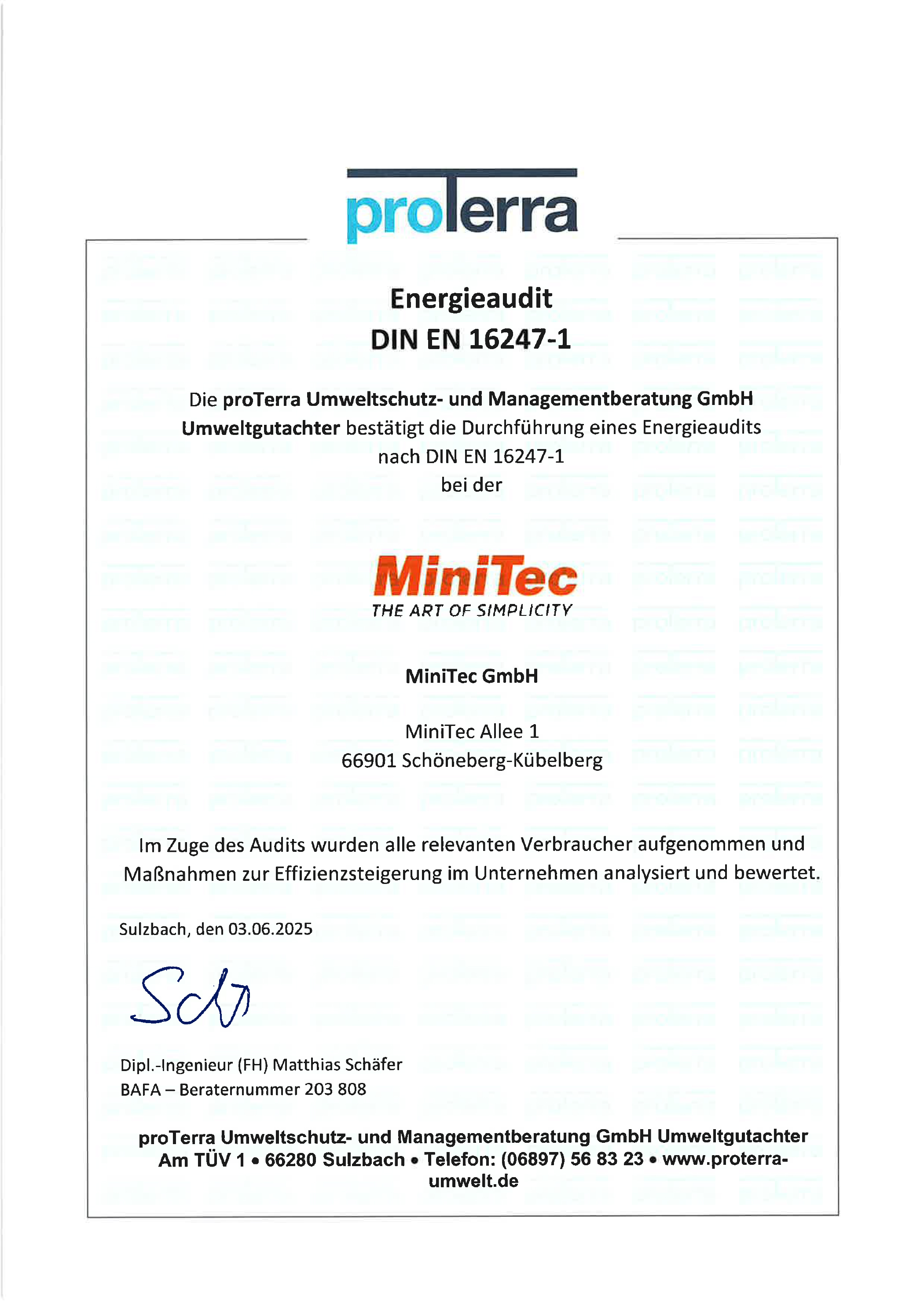 Bereits im Jahr 2016 haben wir uns als KMU freiwillig einem Energieaudit nach DIN EN 16247-1 gestellt und unsere Standorte in Deutschland einer energetischen Prüfung unterzogen, um Einsparpotentiale im Energiebereich festzustellen. Da sich unsere interne Infrastruktur auf neustem Stand befindet konnten nur geringe Einsparpotentiale festgestellt werden. Aber auch diese werden kontinuierlich optimiert und überwacht. Durch unsere hauseigene Stromgewinnung mit umweltfreundlichen Photovoltaikanlagen können wir eine hervorragende CO2-Bilanz vorweisen. Detaillierte Daten sind im Umweltreport veröffentlicht.