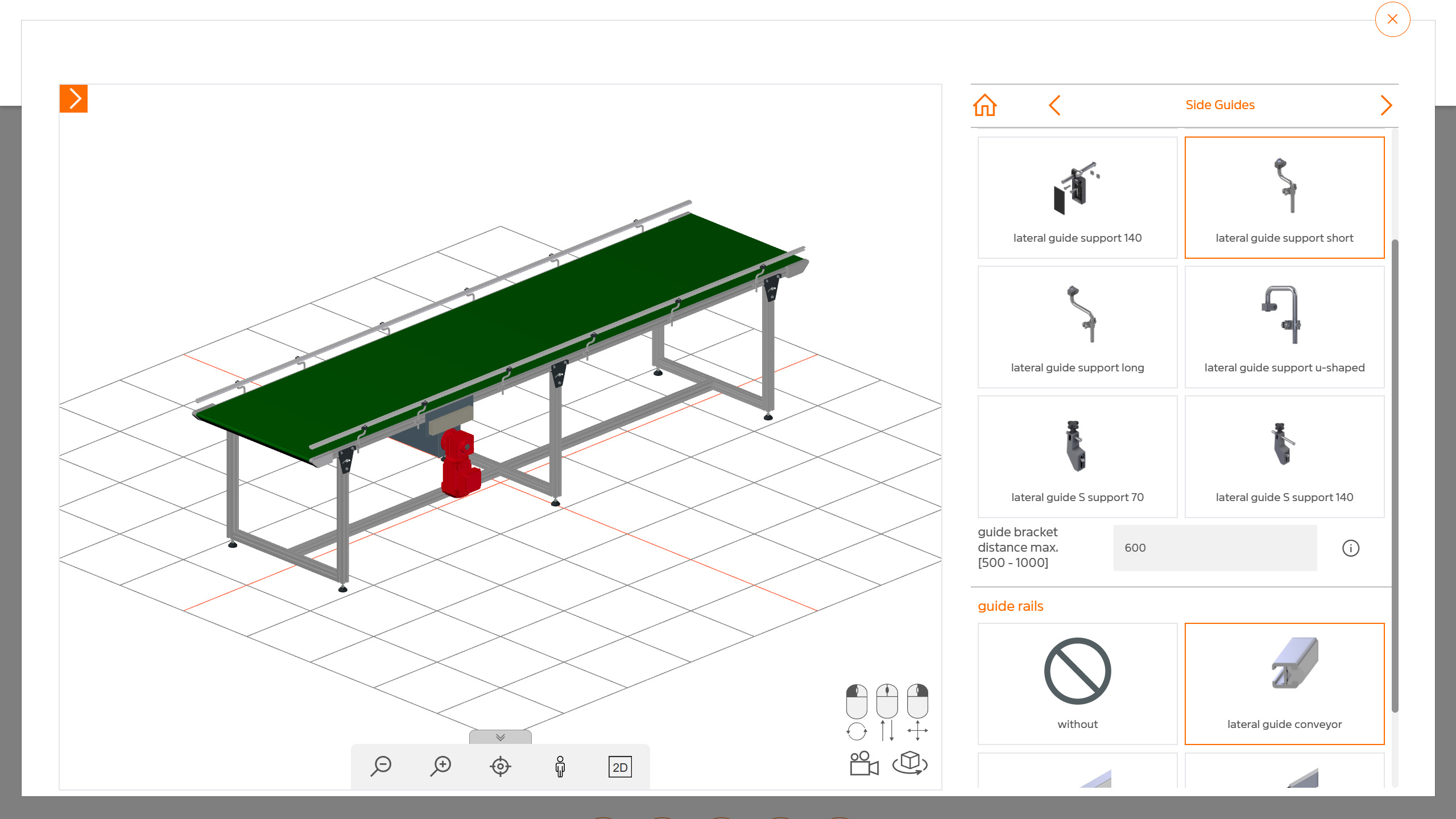 When starting the configurator, general information such as loads, temperatures or other environmental influences are queried first. The user then begins with the actual configuration, where they can specify the conveyor system and all the details regarding dimensions, side guides, supports, drives, conveyor belts and intermediate plates.