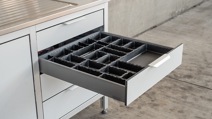 Shelves are now available in two versions. With stainless steel and melamine-coated chipboard, it is now possible to adapt the interior of the furniture to the conditions in the room.