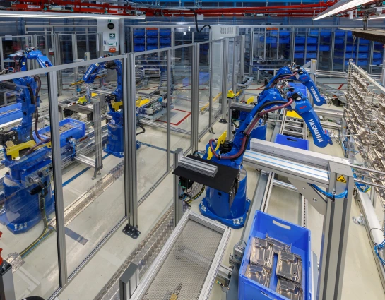 Ausreichend Kapazität durch zwei identische Entnahmeplätze mit insgesamt acht MOTOMAN GP12 Robotern.