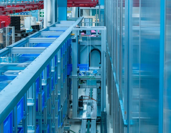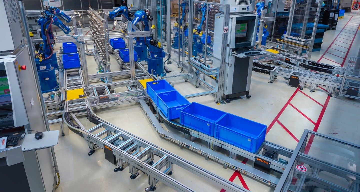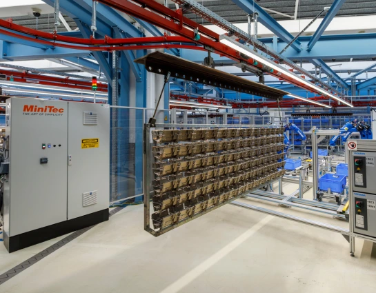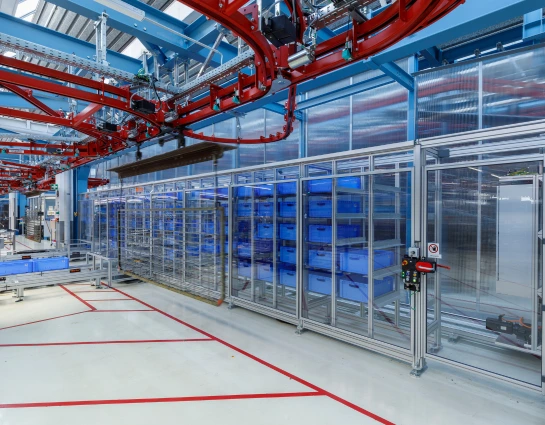 Die befüllten KLTs fahren über eine FMS-Förderstrecke von MiniTec zum Lagerregal, leere Boxen werden den Robotern wieder zur Verfügung gestellt.