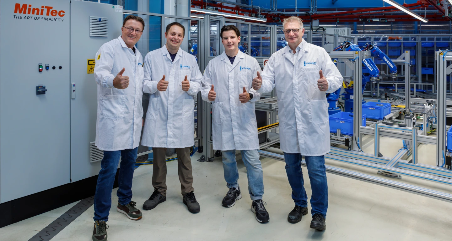 Daumen hoch für die neue Automationslösung (von links): Stefan Wache (MiniTec), Simon Bublies, Moritz Benzing und Joachim Hölzl (alle HMT).