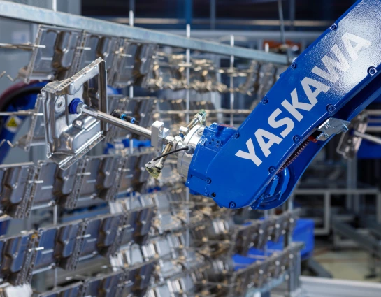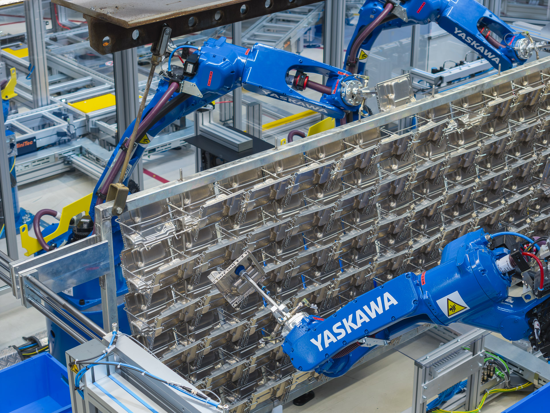Heraus kam schließlich eine hochkomplexe Anlage, bei welcher die Entnahme der gereinigten Bauteile sowie deren Ein- und Auslagerung vollautomatisch von Statten gehen. Dabei sorgt die Ausgestaltung mit zwei identischen Entnahmeplätzen für eine ausreichende Kapazität. Insgesamt acht MOTOMAN GP12 Roboter kümmern sich dort um das Entstücken der Teileträger. Die Roboter der GP-Serie zeichnen sich durch hohe Geschwindigkeiten, Beschleunigungen und Wiederholgenauigkeit aus. Das Ganze ist mit einem vollautomatischen Lagersystem gekoppelt. Die Anlage verfügt mit einer Größe von 20 m x 10 m über beachtliche Ausmaße.