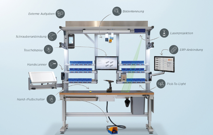 Die offene Architektur des Moduls erlaubt nicht nur die Anbindung an klassische ERP- oder MES-Systeme, sondern auch an andere Softwarelösungen. Ebenso ist die Integration von Hardware wie etwa Schrauber, Waagen, I/O-Baugruppen (Lichtschranken, Ampeln, Sensoren etc.) oder kundenspezifische Komponenten möglich. Sogar Prozessabläufe zwischen verschiedenen Tischen lassen sich darüber steuern und koordinieren.