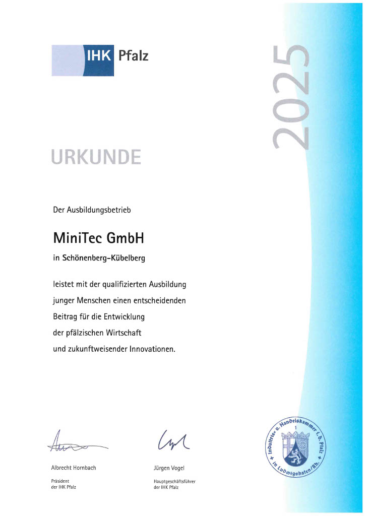 Auch in diesem Jahr wurde MiniTec von der Industrie- und Handelskammer (IHK) wieder als Ausbildungsbetrieb ausgezeichnet.