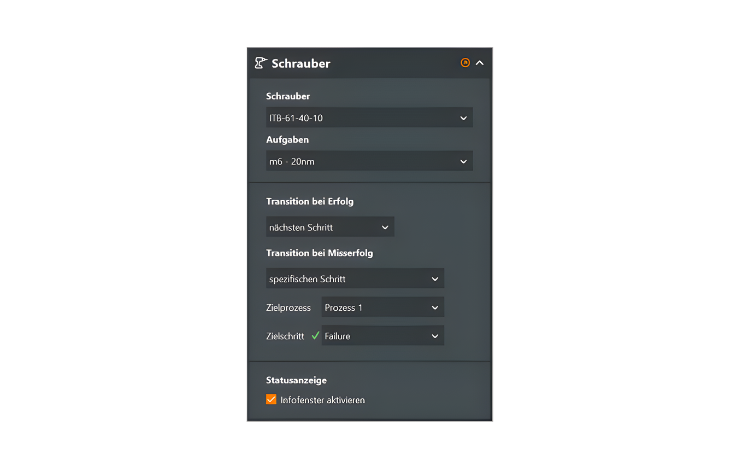 Die Ergebnisse (IO / NIO) werden ans Assistenzsystem zurückgemeldet. Wann ein Ergebnis als „NIO“ gewertet wird, hängt von den Vorgaben des Kunden und seiner diesbezüglichen Einstellungen im Steuergerät ab. Das kann die Überschreitung einer gewissen Anzahl an Drehversuchen sein, aber auch verkantete Schrauben oder das falsche Ansetzen des Werkzeugs können zur Negativmeldung führen. Im Editor lassen sich unterschiedliche Folgeaktionen für die jeweiligen Ergebnisse definieren. Etwa, dass bei NIO der Schraubvorgang erneut gestartet werden soll. Oder, dass der Werker zunächst prüfen soll, welche Verschraubung zum Misserfolg geführt hat, und dann Rücksprache mit seinem Vorgesetzten halten soll.