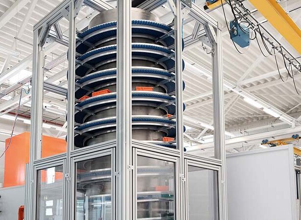 Der Wendelförderer wurde unter dem Aspekt größter Wirtschaftlichkeit konzipiert, ist sehr einfach in Förderstrecken integrierbar, ermöglicht die Überwindung von Höhenunterschieden bis zu drei Meter in Hallen oder Produktionsanlagen und bietet mit mehr als 50 Meter Förderstrecke viel Platz für die Pufferung von Produkten in der Produktion. Und das bei einer sehr geringen Grundfläche von weniger als drei Quadratmeter.